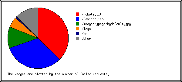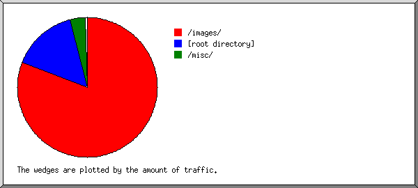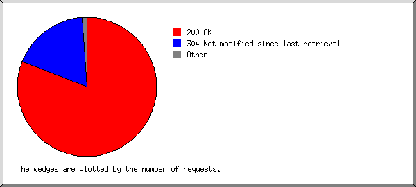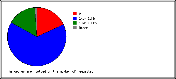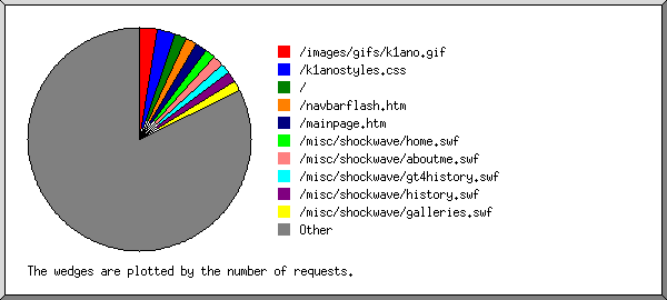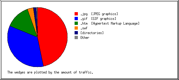 reqs: %bytes: extension ------: ------: --------- 215743: 46.63%: .jpg [JPEG graphics] 42244: 34.51%: .gif [GIF graphics] 34662: 13.34%: .htm [Hypertext Markup Language] 75376: 3.44%: .swf 6888: 1.46%: [directories] 10000: 0.43%: .css [Cascading Style Sheets] 147: 0.10%: .html [Hypertext Markup Language] 149: 0.09%: [not listed: 7 extensions]