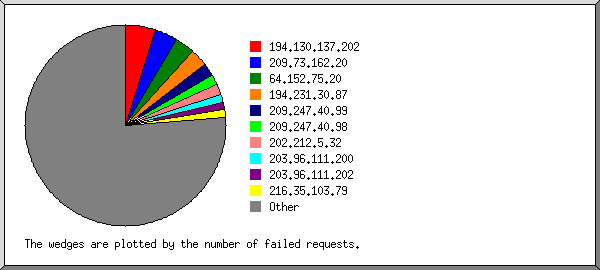 reqs: host ----: ---- 58: 194.130.137.202 41: 209.73.162.20 38: 64.152.75.20 32: 194.231.30.87 24: 209.247.40.99 20: 209.247.40.98 20: 202.212.5.32 14: 203.96.111.200 14: 203.96.111.202 14: 216.35.103.79 13: 203.96.111.201 13: 66.28.68.237 12: 196.2.45.139 12: 195.93.48.152 11: 209.247.40.107 11: 209.73.162.52 10: 64.12.97.6 9: 209.247.40.108 9: 195.92.198.73 9: 24.43.112.95 774: [not listed: 439 hosts]