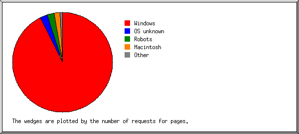 no.: reqs: pages: OS ---: ------: -----: -- 1: 363841: 38586: Windows : 145245: 15610: Windows 98 : 99136: 9939: Windows 2000 : 55286: 5706: Windows Me : 33113: 3571: Windows NT : 28850: 3557: Windows 95 : 2133: 190: Unknown Windows : 76: 11: Windows 3.1 : 2: 2: Windows 32-bit 2: 10157: 1015: OS unknown 3: 1346: 992: Robots 4: 7327: 785: Macintosh : 7327: 785: Macintosh PowerPC 5: 1942: 208: Unix : 1033: 103: SunOS : 812: 85: Linux : 37: 10: IRIX : 59: 10: HP-UX : 1: 0: AIX 6: 244: 53: RISC OS 7: 51: 15: OS/2 8: 177: 14: WebTV